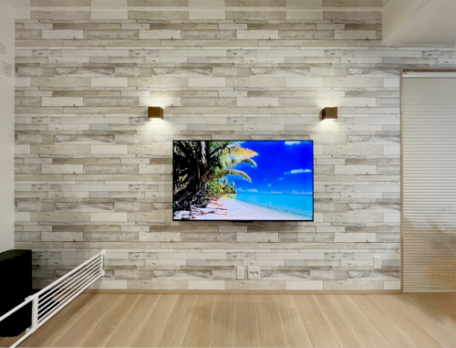 テレビ裏からテレビ下方向に配線用の配管も設置済みの為、今後接続機器が増えても配線は綺麗に収まりますね。