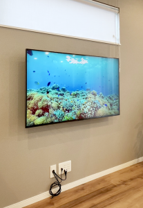 テレビ下方向、テレビボード裏の隠れる位置にコンセント口とアンテナ口があった為、配線はテレビ裏から縦方向にモール処理をする事で、スッキリと収めました。