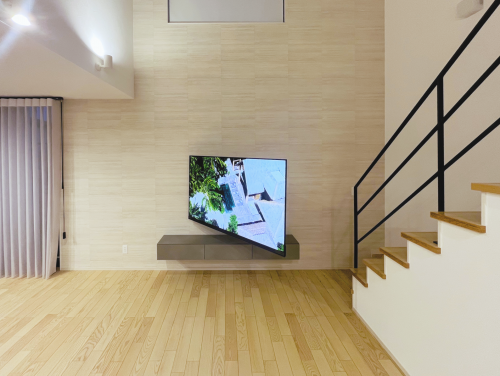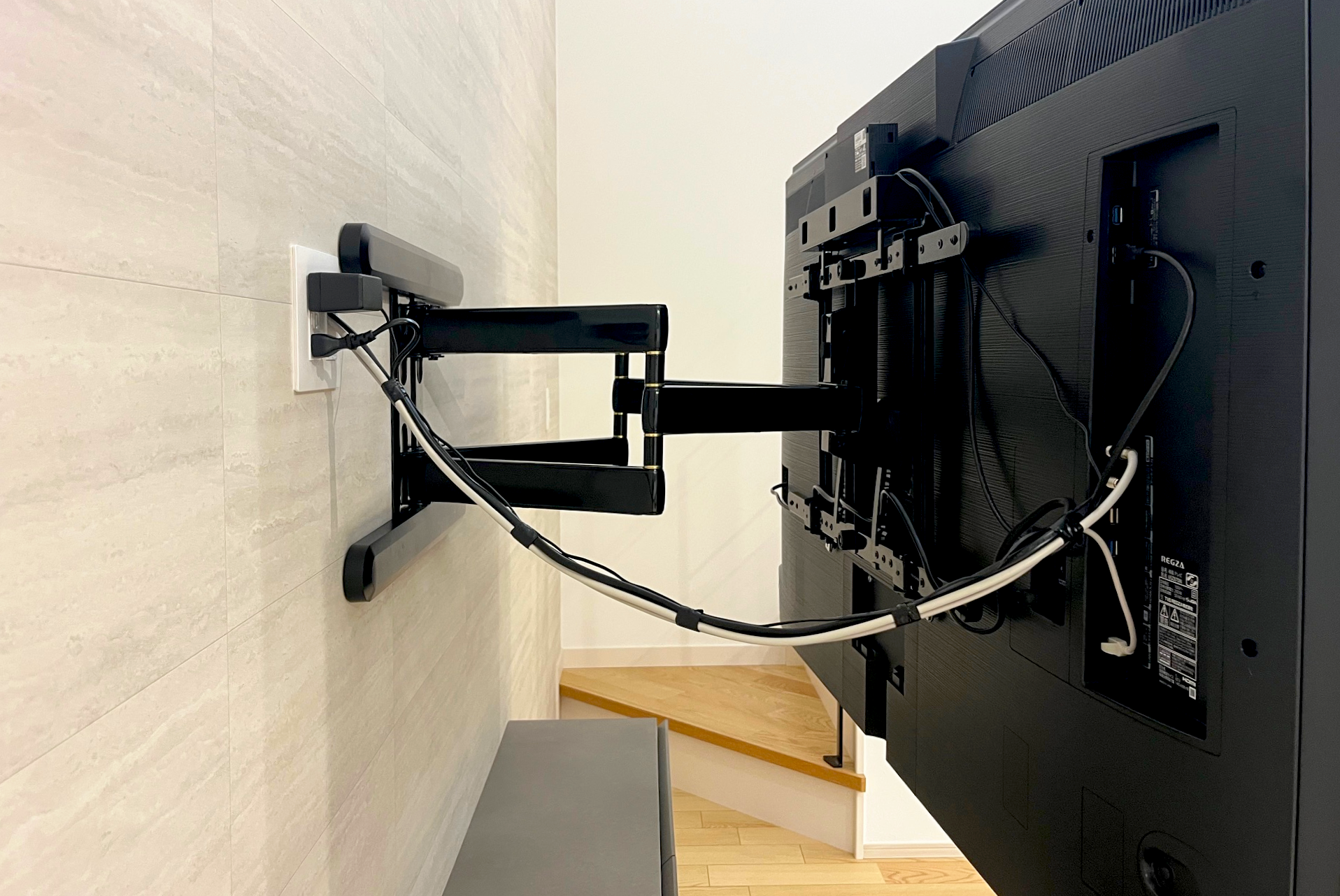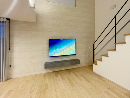 テレビ裏にコンセント口があり、通線用の配管がテレビ裏からテレビボード裏へ縦方向に設置済みだった為、配線は表に一切出ず綺麗に収まりました。