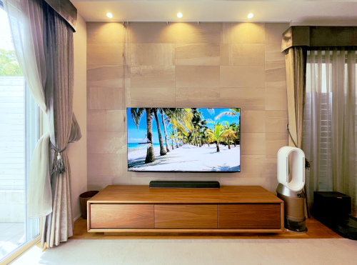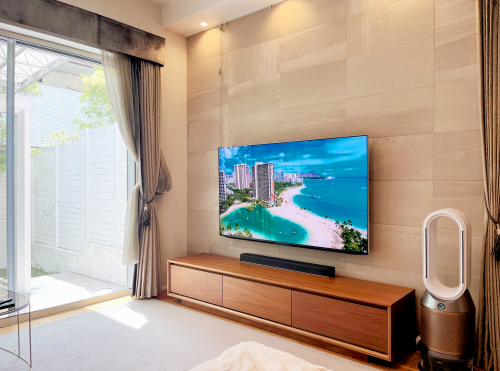 電源類はテレビ裏の隠れる位置にあり、通線用の配管も設置済みだった為、配線は表に一切出ず綺麗に収まりました。