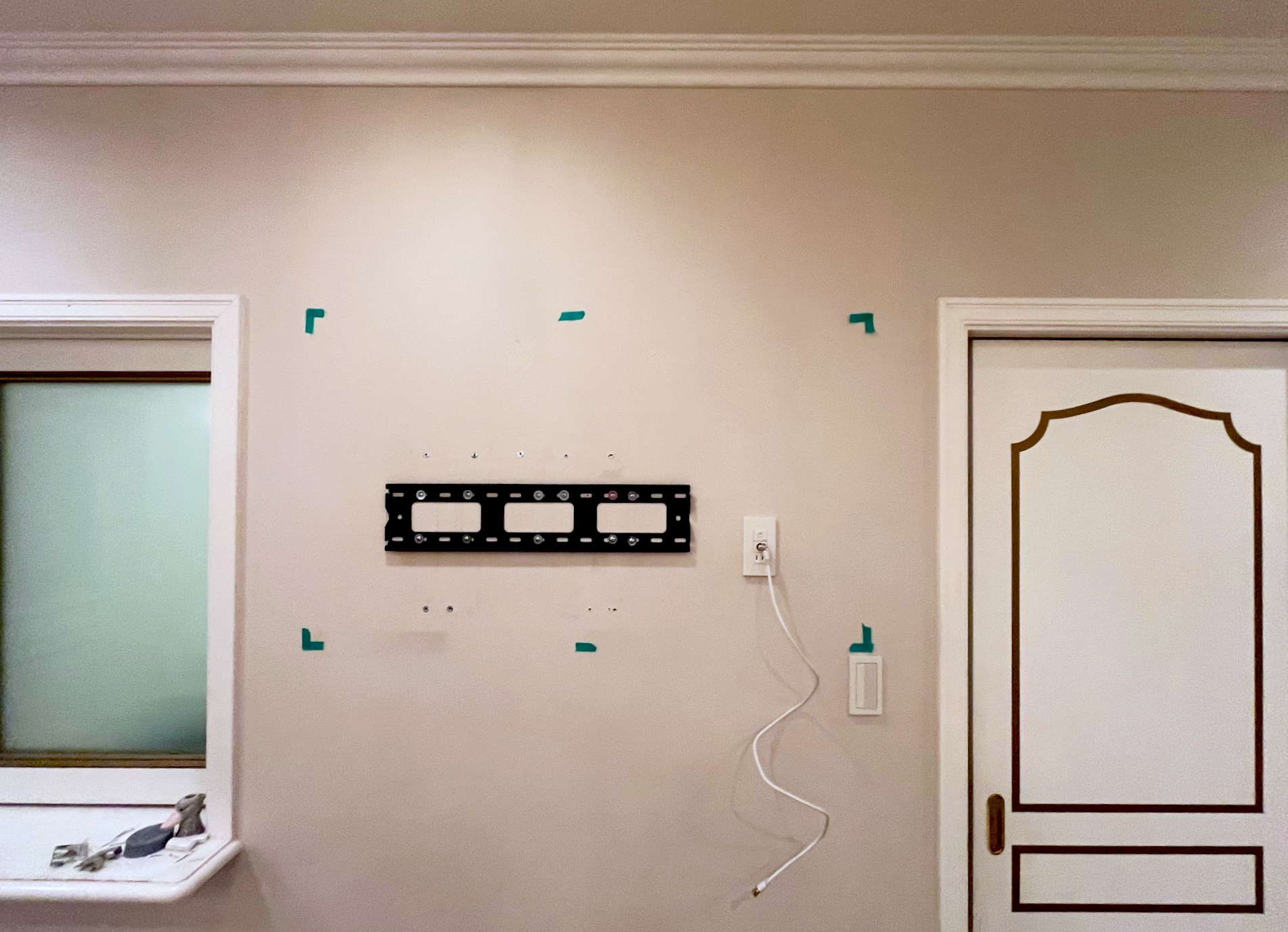 元々テレビの壁掛けをされていましたが、新しくテレビをご購入された為、古い金具を取り外し、壁面の間柱を利用し弊社のフラット金具で設置し直しました。