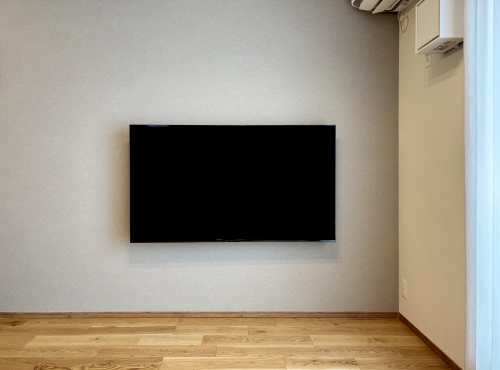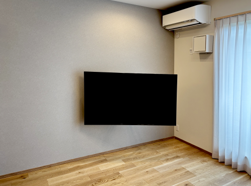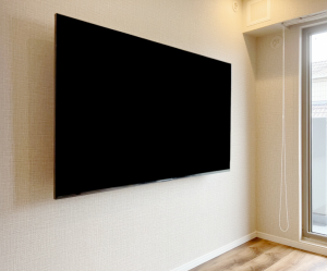テレビ裏の隠れる位置にコンセント類が設置済みだった為、配線はスッキリと収まりました。