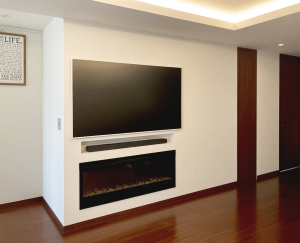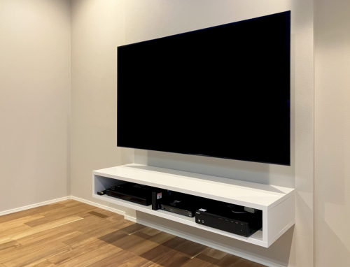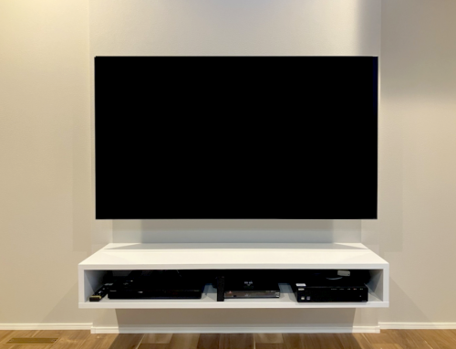 テレビ裏にコンセント類があり、通線用の配管もテレビ裏からテレビボード裏に向かって縦方向に設置済みだった為、配線はスッキリと収まりました。