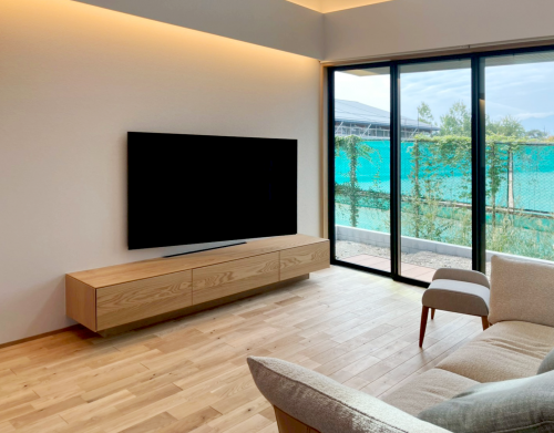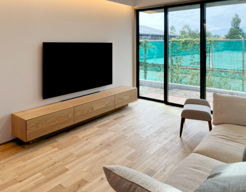 テレビ裏にコンセント類があり、通線用の配管も設置済みでしたので、配線はスッキリと収まりました。