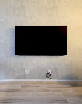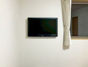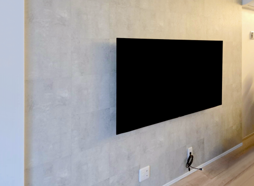 テレビ裏とテレビ下にコンセント類があり、テレビ裏からテレビ下方向に向かって縦方向に通線用の配管も設置済みだった為、配線は綺麗に収まりました。