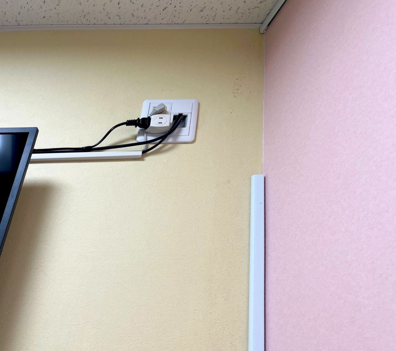 テレビ向かって右上に電源類が設置済みで、そちらから通線用の孔も縦方向に設置済みだった為、配線はスッキリと収まりました。