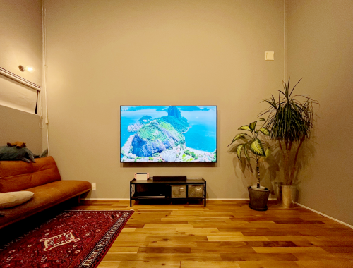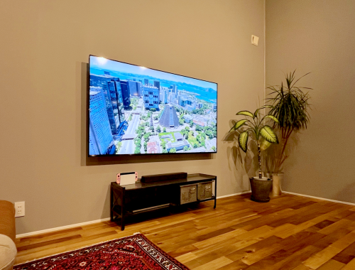 テレビ裏とテレビ下にコンセント類があり、テレビ裏からテレビ下方向に向かって縦方向に通線用の配管も設置済みだった為、配線はスッキリと収まりました。