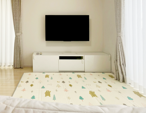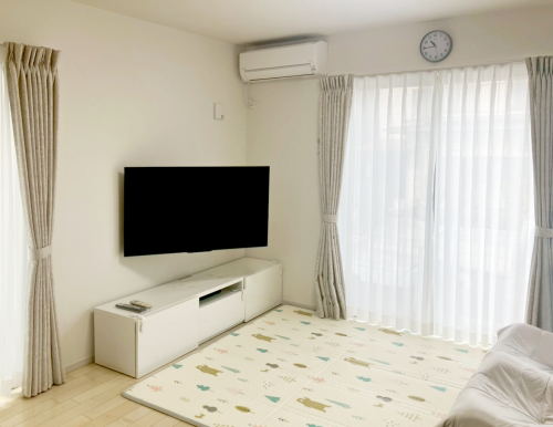 テレビ下方向にコンセント類が設置済みでしたので、配線はテレビ裏からコンセント横へ向かって縦方向に壁の中を通す隠蔽処理を施し、スッキリと収めました。