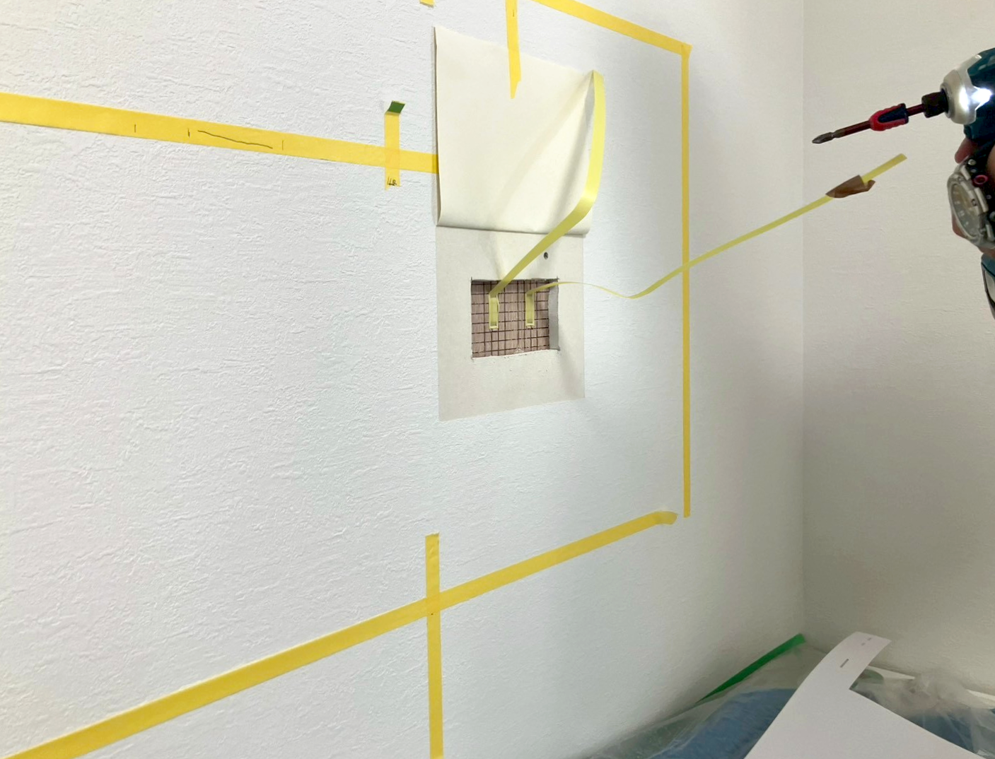 壁の補強:金具設置予定の壁面に穴を開け、特許取得の補強材を入れて固定します