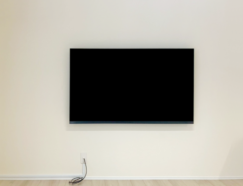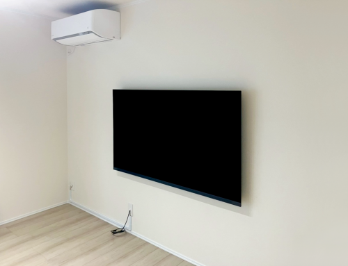 石膏ボードの壁にジャストップ工法で補強を行ない、フラット金具で65型テレビの壁掛けをいたしました。
