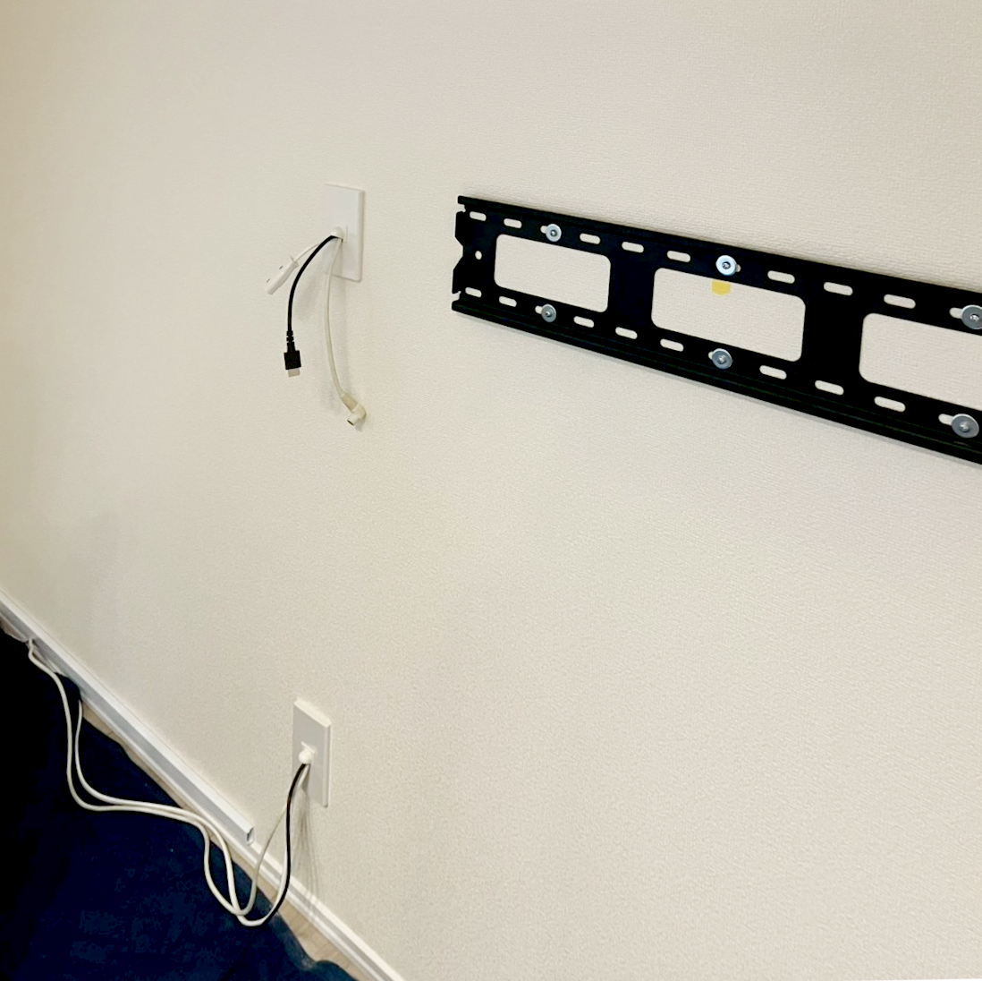 テレビ向かって左端下にアンテナ口とコンセント口があった為、縦方向の配線はテレビ裏からテレビ下に向かって壁の中を通す隠蔽処理をし、横方向はモール処理を行いスッキリと収めました。
