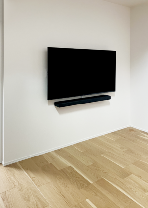 補強済みの壁に55型のテレビとサウンドバーを取付けいたしました。