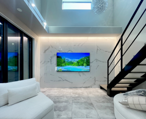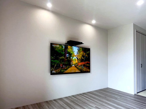補強済みの壁に65型のテレビをフラット金具で設置し、同時にAVラック取付のご依頼もいただきました。