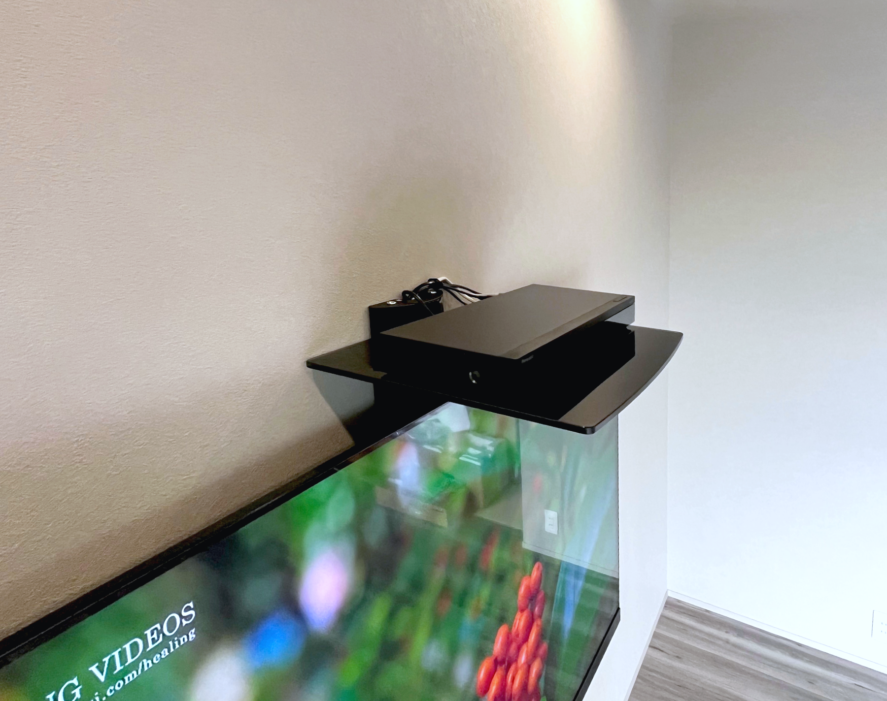 AVラック上にはAV機器を設置し、散らかりがちなテレビ周りの機器や配線が、壁掛けをすることでスッキリと収まりました。