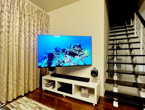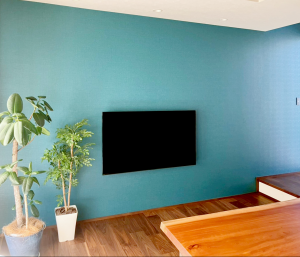 テレビ裏とテレビボード裏の隠れる位置にコンセント類があり、テレビ裏からテレビボード裏に向かって通線用の配管も設置済みだった為、配線はそちらを通す事で、スッキリと収まりました。