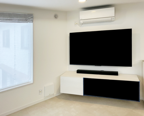 テレビ裏の隠れる位置にコンセント類があり、通線用の配管も設置済みだった為、配線は表に一切出ず綺麗に収まりました。