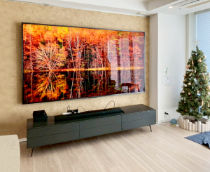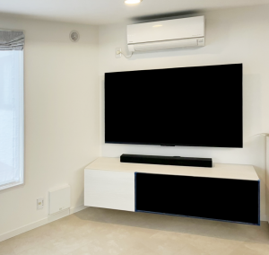 サウンドバーの配線も、サウンドバー裏からテレビ裏に向かって縦方向に壁の中を通し、表からは配線が一切見ない仕上がりになりました。