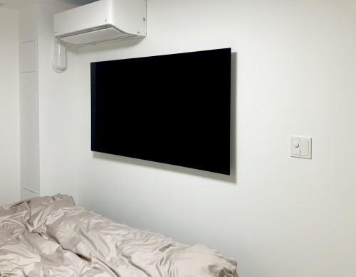 85型の配線は、テレビ取付け壁面の向かって左下のコンセントではなく、反対側のお部屋のコンセントへ繋がる様に壁を貫通させ、壁の中に通す隠ぺい処理をしました。