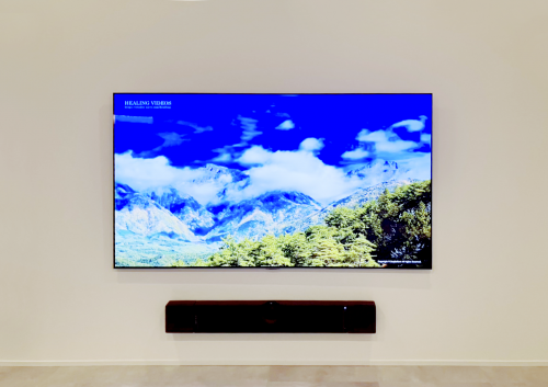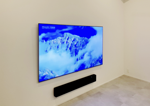 83型はテレビ裏がニッチ仕上げになっており、コンセント類がニッチ内にあり、通線用の配管がニッチ内からサウンドバー裏に向かって設置済みでしたので、表からは配線が一切見えない仕上がりになりました。