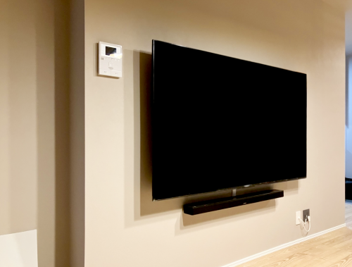 石膏ボードの壁にジャストップ工法で補強を行ない、75型のテレビとサウンドバーを取付けいたしました。