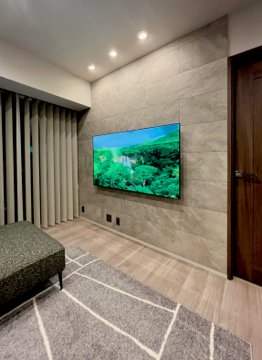 テレビ裏の隠れる位置にコンセント類が配置されていた為、配線はすべてテレビ裏で処理でき、表に一切出ることなく美しく収まりました。