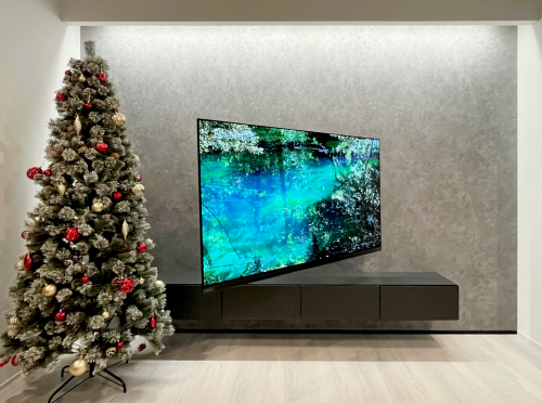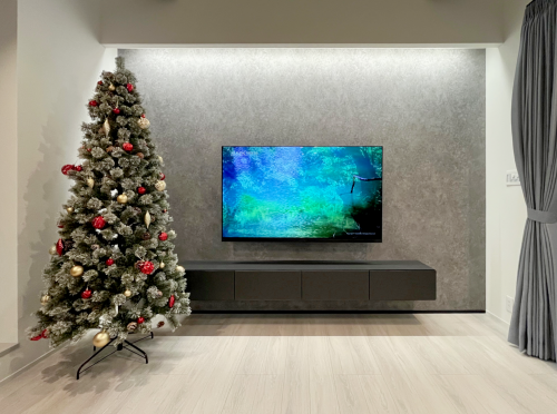 テレビ裏とテレビボード裏にコンセント類があり、テレビ裏からテレビボード裏に向かって縦方向に通線用の配管も設置済みでしたので、配線はそちらを通す事で表に一切出ず綺麗に収まりました。