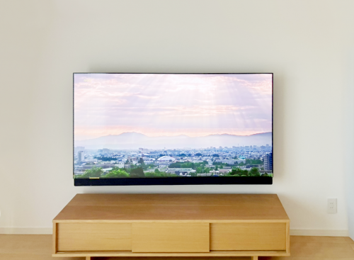 テレビ向かって真下にコンセント類があった為、配線はテレビで隠れる位置の壁から下に向かって縦方向に壁の中を通す隠ぺい処理をし、スッキリと納めました。