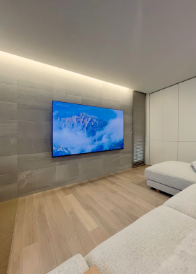 テレビに隠れる位置の壁面にコンセント類があり、テレビ裏からテレビ向かって90度右側の棚の中に繋がる通線用の配管も設置済みだった為、外からは一切配線が見えないスッキリとした仕上がりになりました。