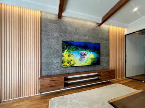 テレビで隠れる位置の壁面にコンセントとアンテナ口が設置済みでしたので、外からは一切配線が見えないスッキリとした仕上がりになりました。