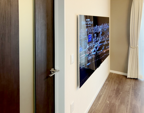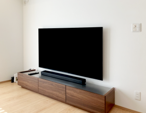テレビで隠れる位置の壁面に電源を増設し、配線はそちらに繋ぐことで、外からは一切配線が見えないスッキリとした仕上がりになりました。