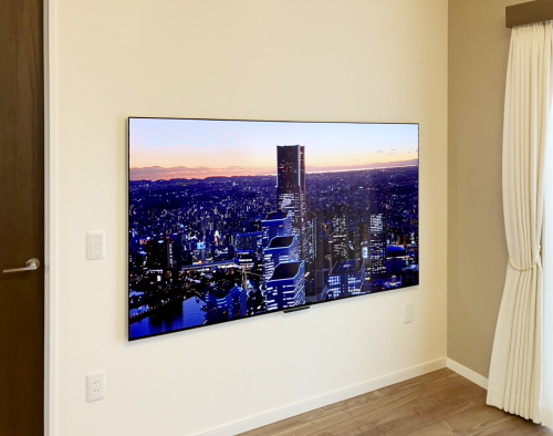 石膏ボードの壁でしたが間柱を利用し、77型のテレビをお客様保有のスイング金具で取付けいたしました。