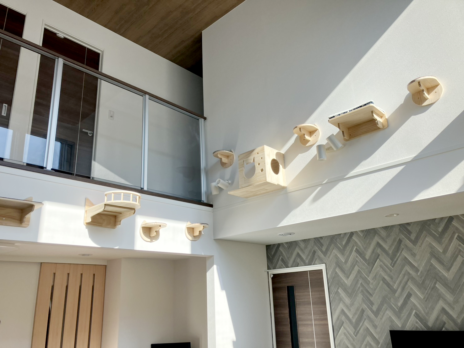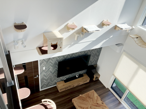 以前、テレビを壁掛けさせていただいた方から、追加でfukumaruとMIUZMOREのキャットステップの取付けのご依頼をいただき、補強済みの壁に14個のキャットステップを壁掛けいたしました。