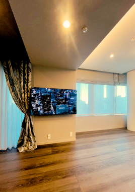 補強済みの壁に55型のテレビをスイング金具で取付けいたしました。