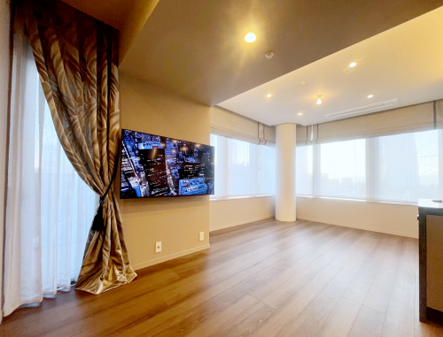 壁掛けを想定し、テレビで隠れる位置の壁面にコンセント類が設置済みでしたので、配線はそちらに繋ぐことで綺麗に収まりました。