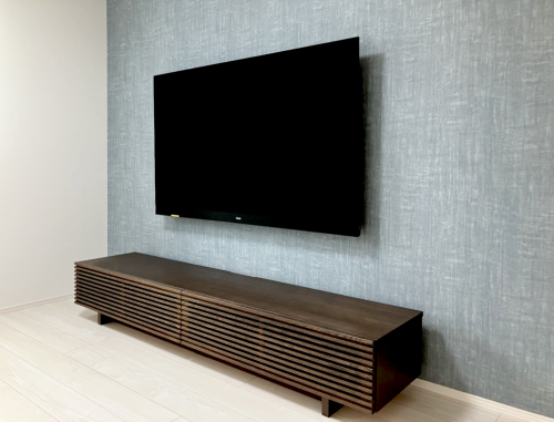 テレビで隠れる位置の壁面にコンセント類があり、テレビ裏からテレビボード裏に向かって縦方向に通線用の配管も設置済みだった為、配線はスッキリと仕上がりました。