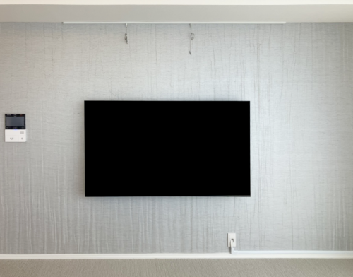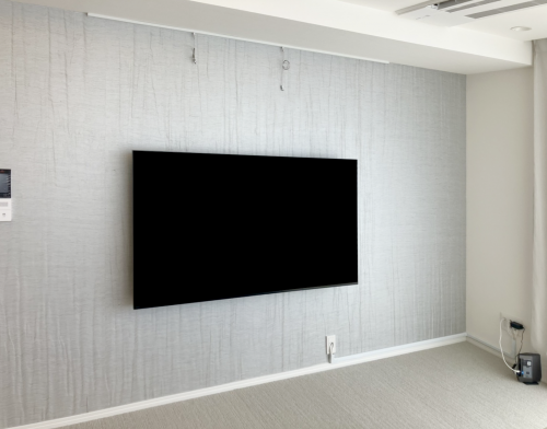 石膏ボードの壁にジャストップ工法で補強を行い、65型のテレビをお客様保有のスイング金具でお取付のご依頼をいただきました。