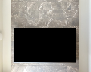 テレビボードも取付位置に壁の補強を行い、配線は、既存のコンセント類がテレビボード取付予定の向かって左下にありましたが、既存コンセント下からテレビボード下まで巾木に沿って横方向はモール処理をし、縦方向はテレビボードに隠れる位置の壁面に電源とアンテナ口を増設し、テレビボードからテレビまでは壁の中に配線を通す隠ぺい処理をした事で、外からは一切配線が見えない美しい仕上がりとなりました。