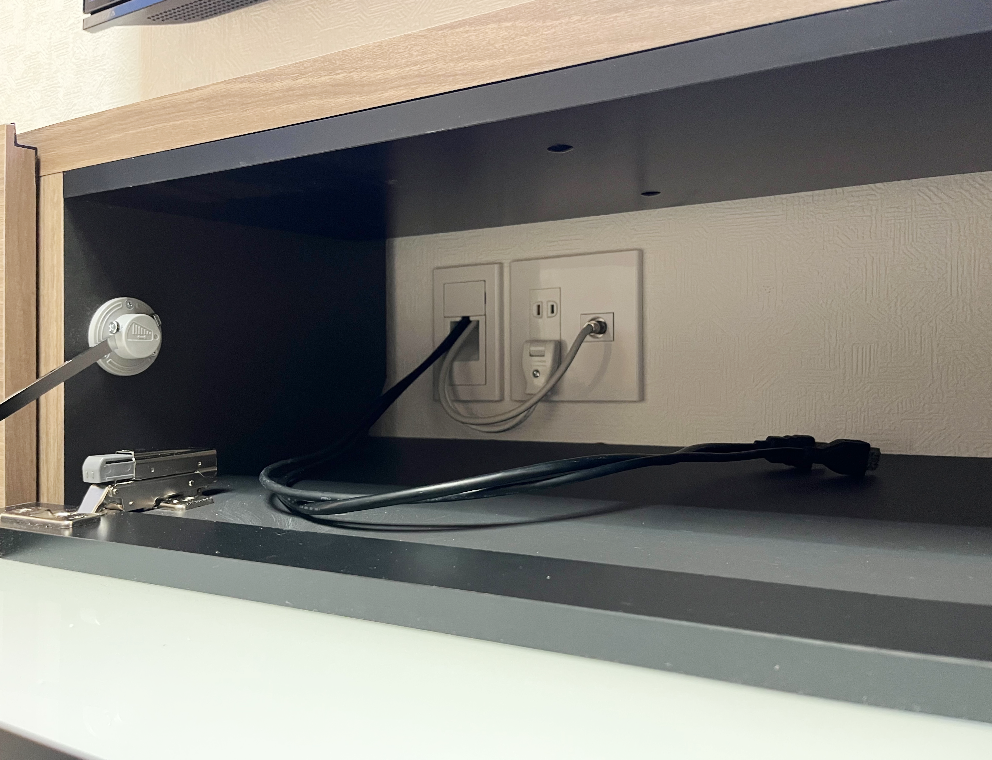 TVボードに隠れる位置の壁面に電源とアンテナ口を増設し、隠ぺい処理の孔を作成