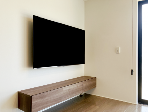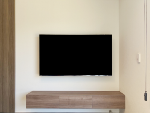 壁掛けを想定し、テレビに隠れる位置の壁面にコンセント類が設置済みでしたので、配線はスッキリと収まりました。