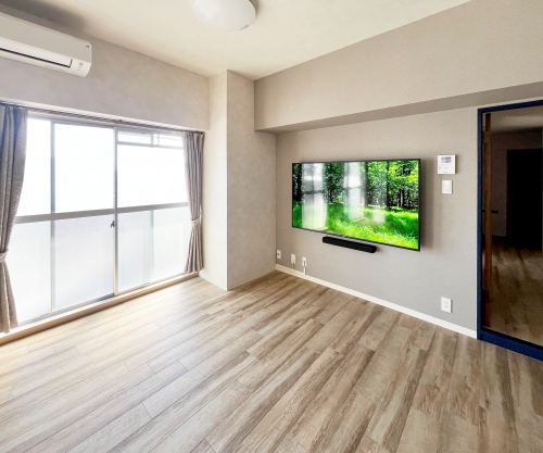 石膏ボードの壁にジャストップ工法で補強を行い、スイング金具で65型のテレビとサウンドバーを取付けいたしました。