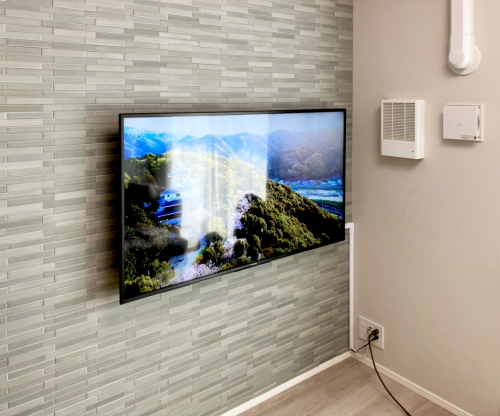 テレビお取付け壁面の向かって90度右下にコンセント類があった為、配線は、壁端に沿ってモール処理を行いスッキリと収めました。