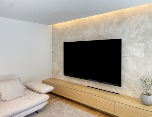 補強済みの壁に85型のテレビをフラット金具で取付けいたしました。