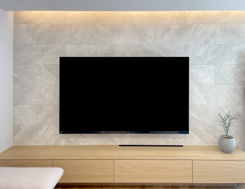テレビで隠れる位置の壁面にコンセント類が設置済みでしたので、テレビの配線はそちらに繋ぐ事で、表からは配線が一切見えない仕上がりになりました。